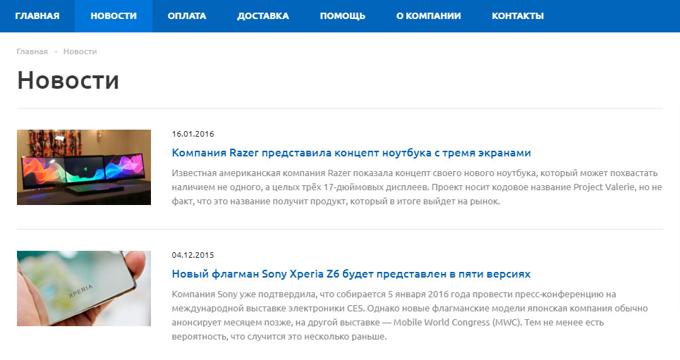 Разделы сайта: Новости, Оплата, Доставка, О компании, Контакты