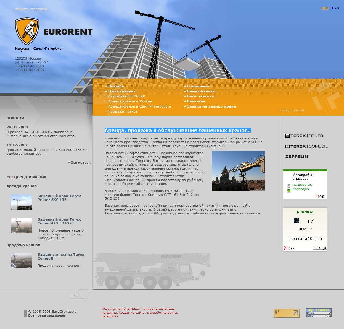Создание корпоративного сайта аренды и продажи башенных кранов. Компания предлагает в аренду строительным организациям башенные краны немецкого производства. Компания работает на российском строительном рынке с 2003 г.