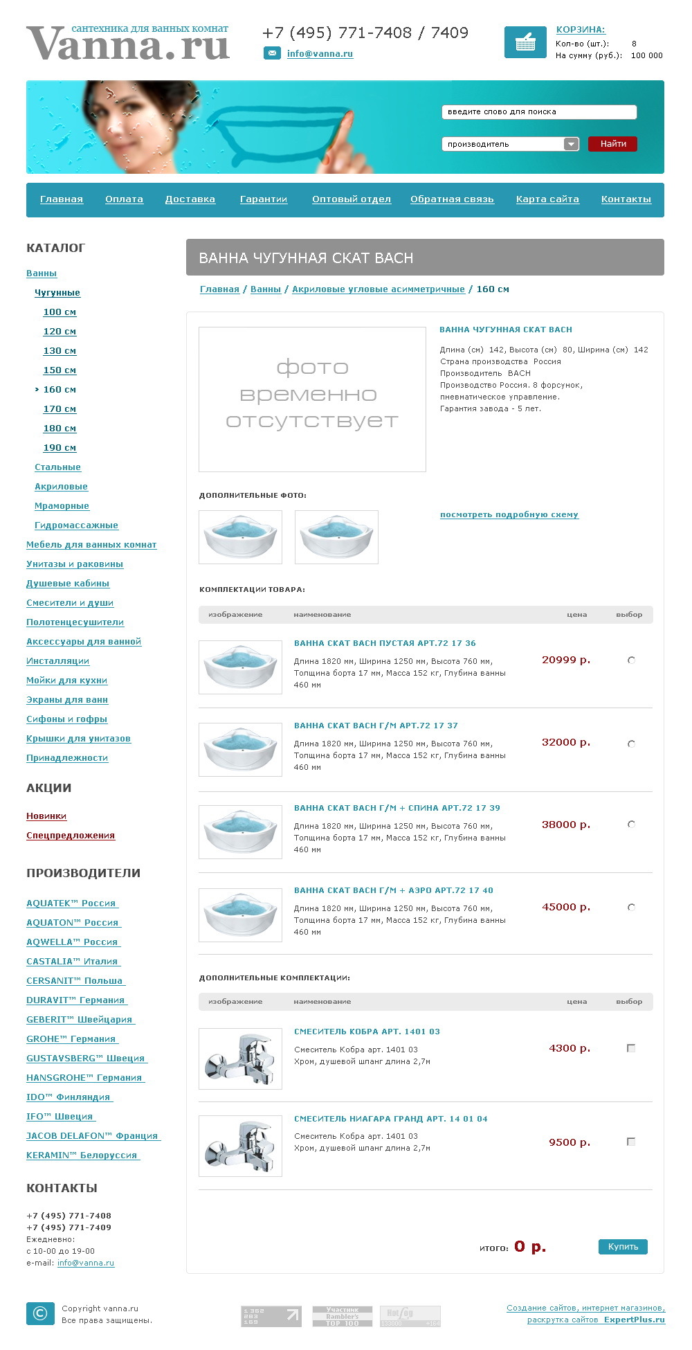 Мы знаем всю специфику данной категории товаров. Мы знаем все о том, каким должен быть виртуальный магазин, приносящий солидный доход своему владельцу. Создание интернет-магазина сантехники начнется с того, что мы с вами обсудим, какими функциями должен обладать сайт-магазин. Если же какая-либо необходимая вам функция не предусмотрена в стандартном наборе, то такой модуль будет создан специально для вас нашими программистами. Что касается дизайна, то вы можете воспользоваться уже готовым решением, а можете заказать высококлассным дизайнерам, работающим в нашей команде, создание уникального оформления для вашего магазина.