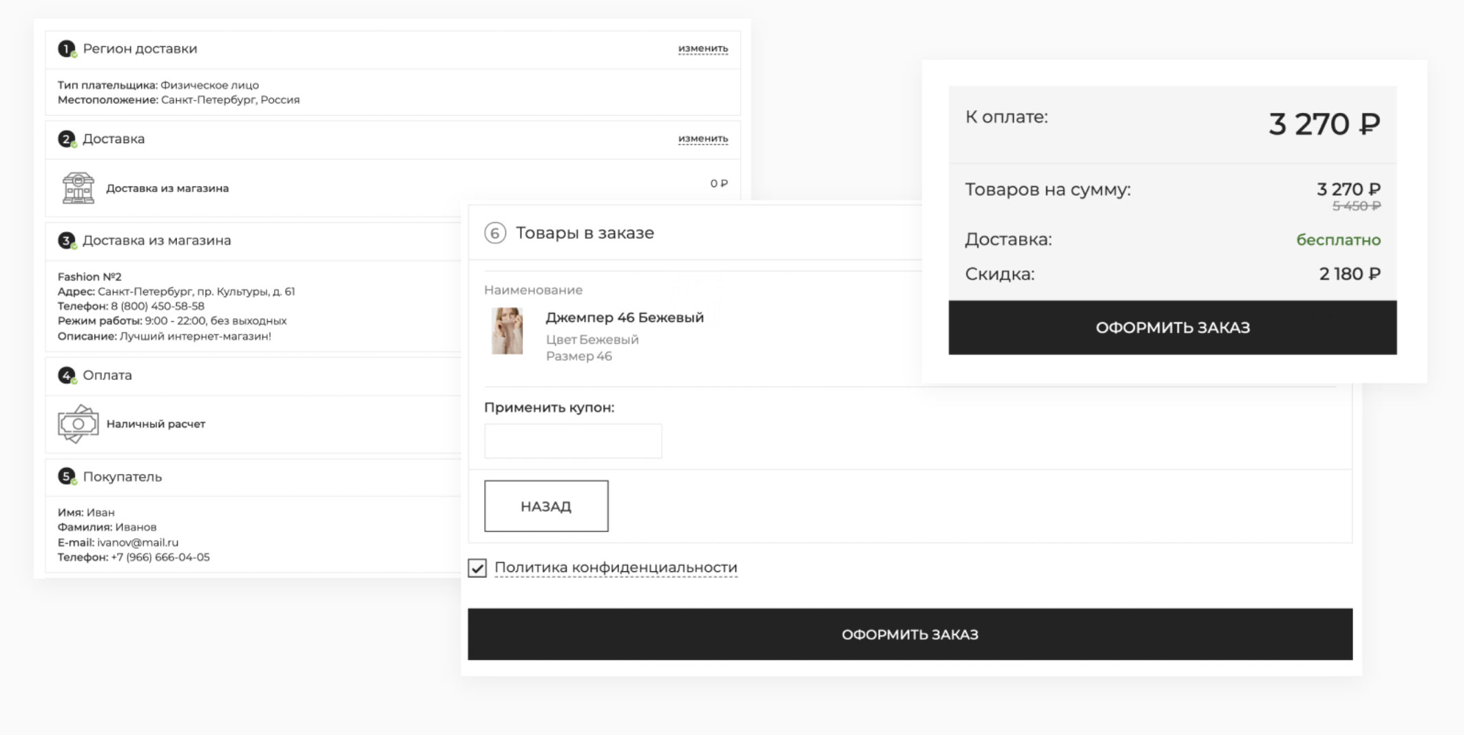 Оформление заказа позволяет за несколько шагов выбрать подходящий способ доставки и оплаты