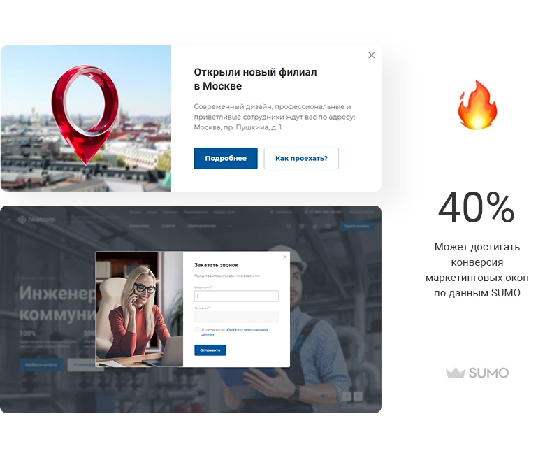 - Маркетинговые окна. Функционал позволяет собирать обратную связь с клиентов, предлагать индивидуальную скидку и выводить приглашение на мероприятия. Маркетинговое окно появляется у посетителей по сценарию, который вы задаете сами.