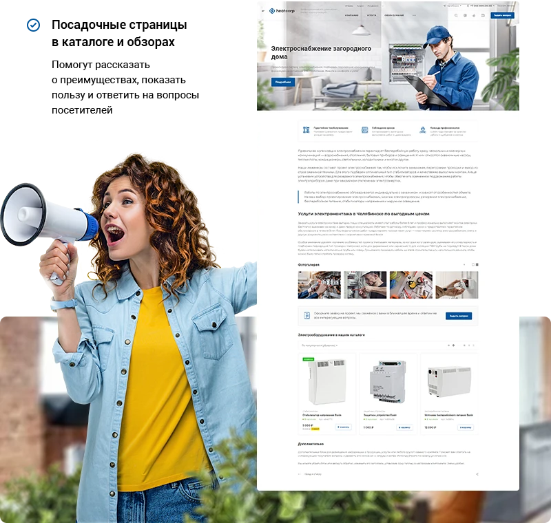 Добавляйте посадочные страницы в каталоге, обзорах и услугах, чтобы рассказать о преимуществах, сформировать доверие пользователей и ответить на часто задаваемые вопросы.