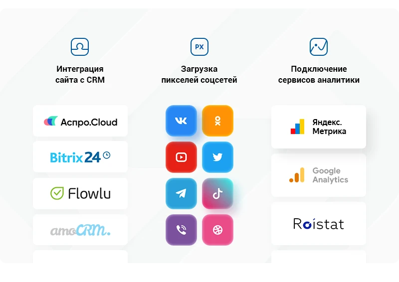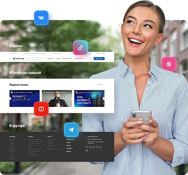 Социальные сети помогают поддерживать связь с клиентами. Для привлечения трафика вы можете добавить блок с видеоотзывами на главную страницу, а также разместить иконки соцсетей в шапке и футере.