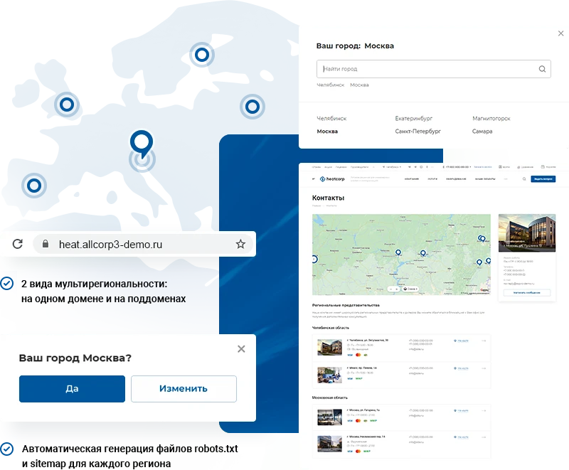 Мультирегиональность поможет запустить крупный проект и расширить географию продаж. Добавляйте контентные разделы и контактную информацию для каждого региона.
