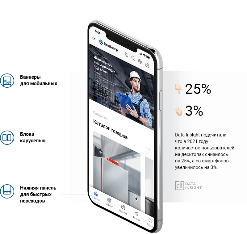 Сайт на решении "Инжиниринг" легко адаптируется под смартфоны и планшеты. Не теряйте трафик с мобильных устройств и уменьшайте количество отказов.