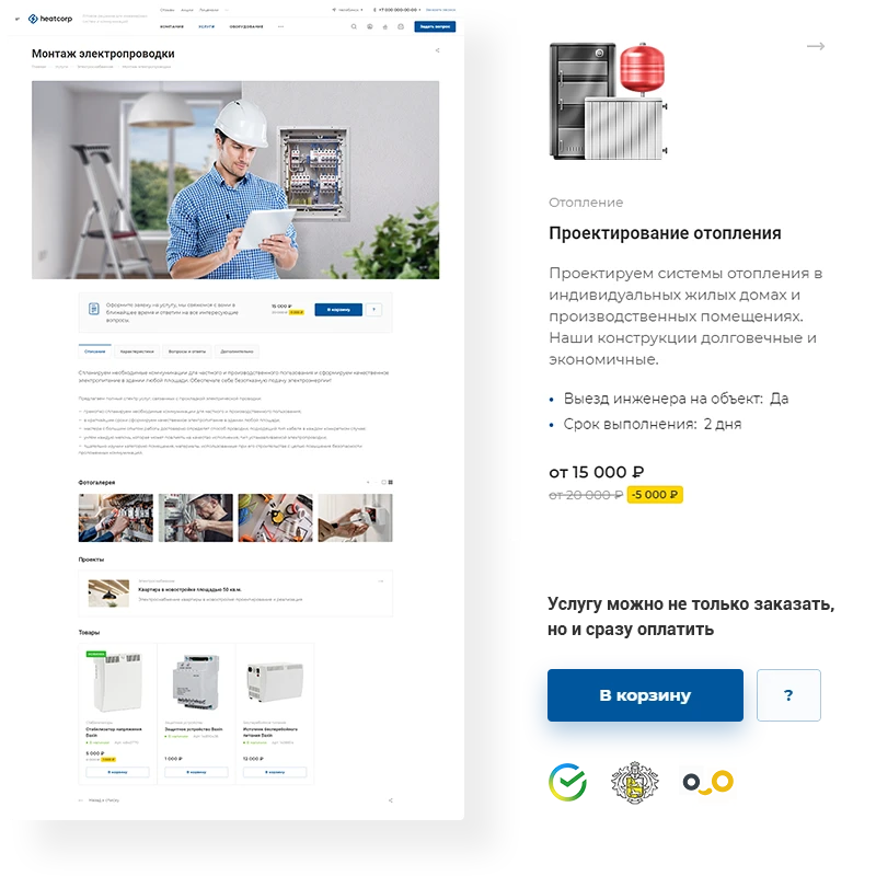 - Прием платежей. Принимайте авансовые платежи, оплату за проектирование и монтаж инженерных систем. Получайте не просто заявки в форме, а реальный доход.