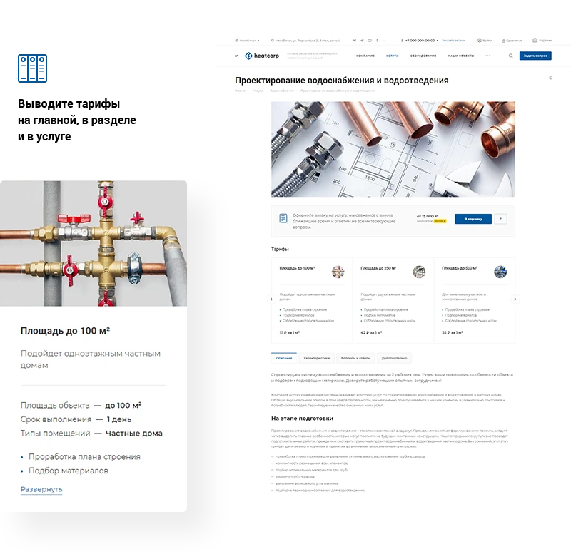 Инжиниринговые сделки отличаются четкими требованиями заказчика к комплексу работ. Поэтому детальные страницы инженерных услуг содержат подробное описание, преимущества, изображения, отзывы и видео. Подключайте тарифы на монтаж и проектирование систем с ценами в зависимости от площади объекта.