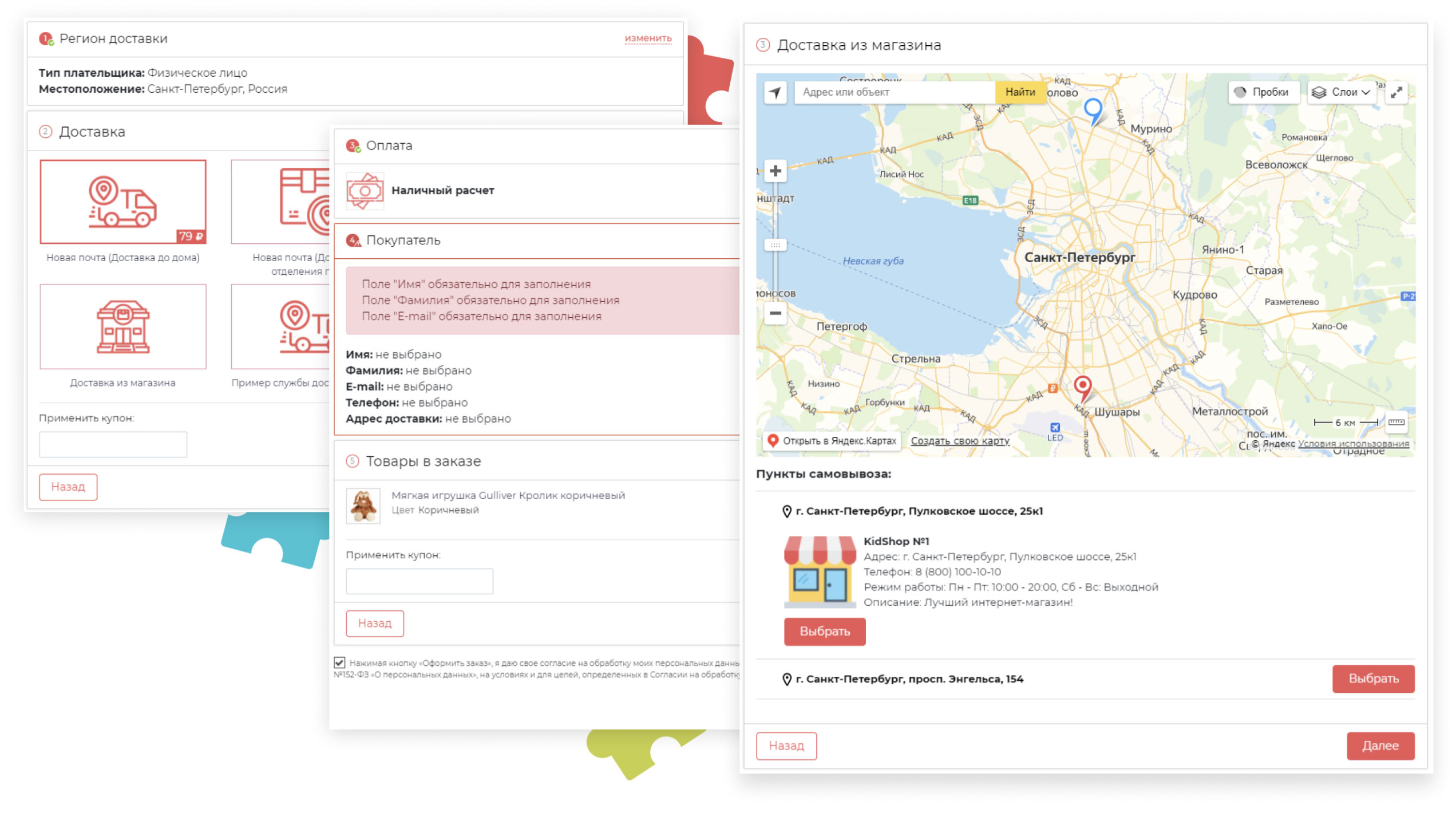 Оформление заказа позволяет за несколько шагов выбрать подходящий способ