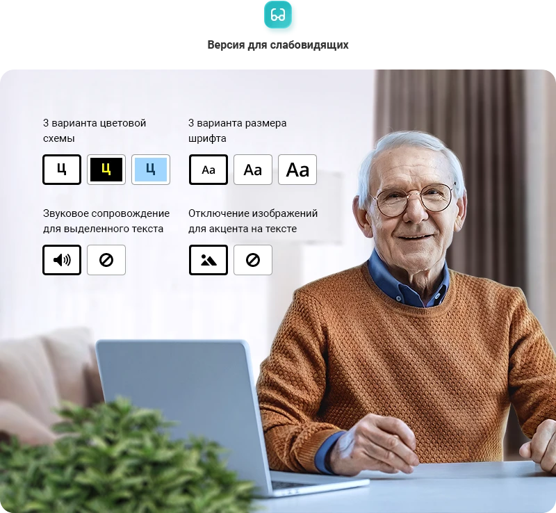 Функция активируется в 1 клик — кнопка переключения расположена в шапке сайта. Пользователь сможет выбрать размер шрифта и подходящую цветовую схему.