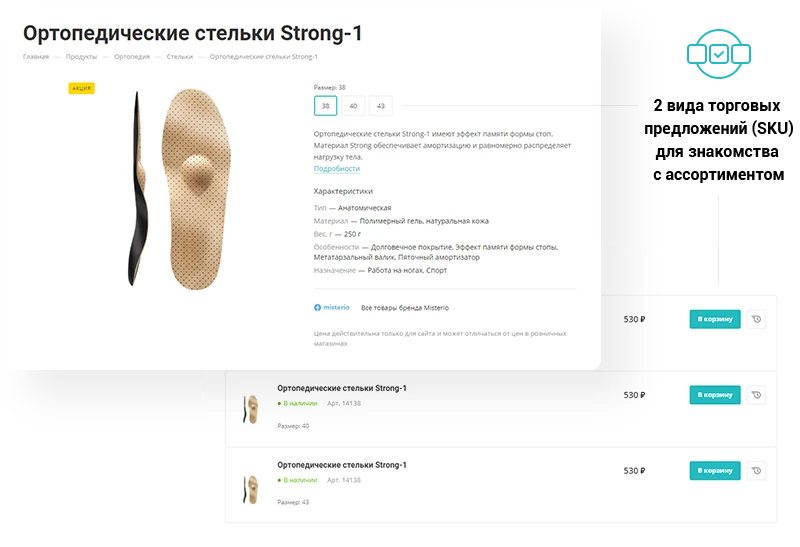 - Торговые предложения (SKU) для компактного каталога — товары разных цветов или объема можно разместить в одной карточке.