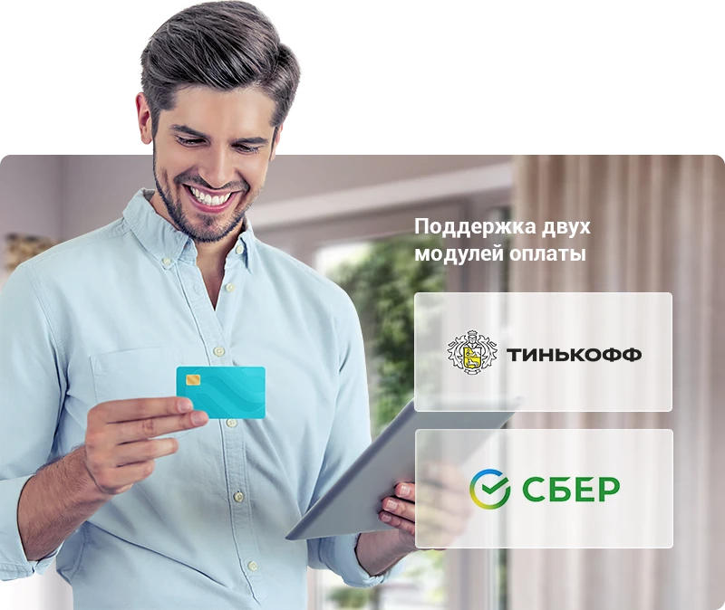 - Поддержка модулей онлайн-оплаты «Интернет-эквайринг Сбербанк РФ (прием платежей)» и «Интернет-эквайринг Тинькофф прием платежей» для приема платежей прямо через сайт.