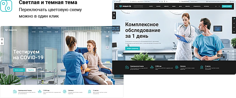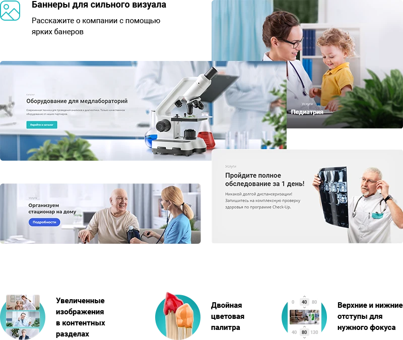Как будет выглядеть ваш сайт — решать только вам. В готовом решении "Медицинский центр 3.0" реализован целый арсенал настроек дизайна. Добавьте логотип, выбирайте цвета оформления, размещайте свои баннеры или используйте готовый демоконтент и готовые варианты настроек.