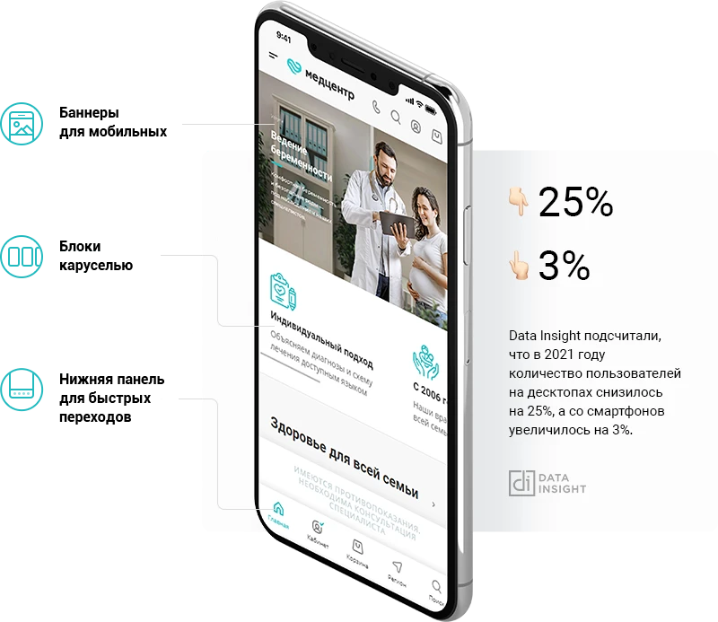 Записаться на прием можно даже с телефона — сайт адаптируется под экраны любых размеров. Отображение элементов сайта на мобильных устройствах можно легко настроить через виджет в публичной части.