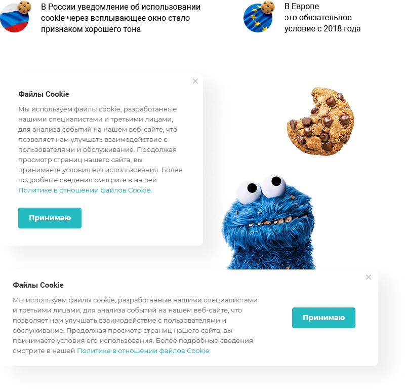 Cookie — файлы с информацией о посетителях сайта. Благодаря этим файлам владельцу проекта и рекламодателям проще собирать статистику, а пользователям не нужно каждый раз авторизоваться. Уведомлять пользователей об использовании cookie-файлов через всплывающее окно в России считается признаком хорошего тона, а в Европе это обязательное условие с 2018 года.