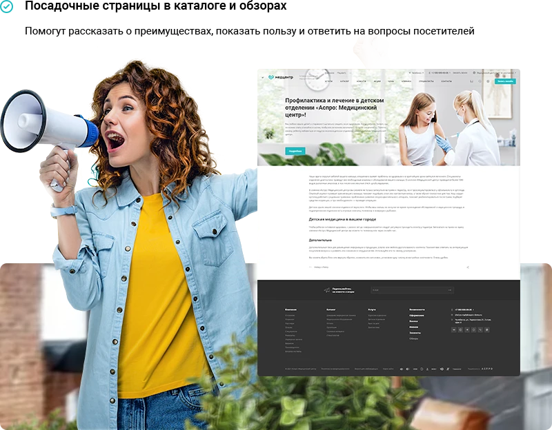 Рассказывайте об услугах, достоинствах и новшествах клиники и мотивируйте клиентов совершить целевое действие через посадочные страницы. Покажите пользу ваших услуг, заранее отвечайте на вопросы пациентов. Создавать их можно в обзорах или в каталоге.