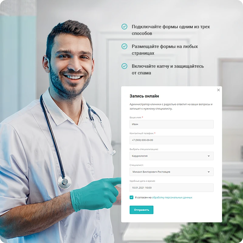 Клиент сможет оставить контактные данные и записаться на прием всего в 2 клика! Подключайте вариант сбора заявок, который подходит вашему проекту — формы в решении можно добавлять тремя способами: