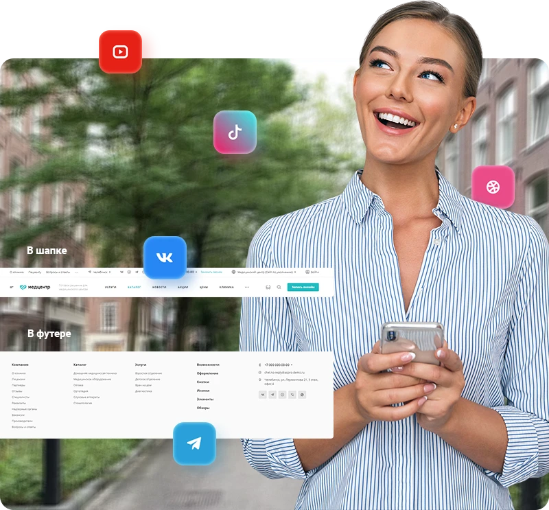 Ваша аудитория проводит время в социальных сетях и общается через мессенджеры. Разместите в шапке и футере ссылки на аккаунты клиники и станьте ближе к пациентам!