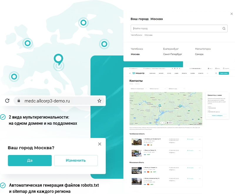 Расширяйте возможности вашей клиники и привлекайте новых клиентов с функционалом мультирегиональности. Продвигайте сайт на одном домене или создавайте поддомены для каждого из филиалов.