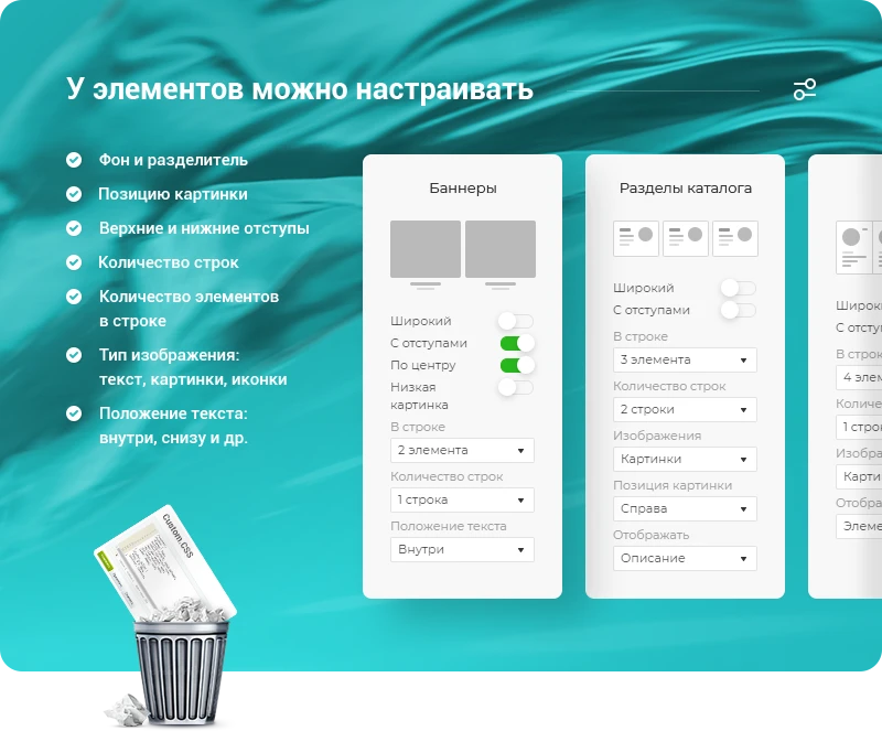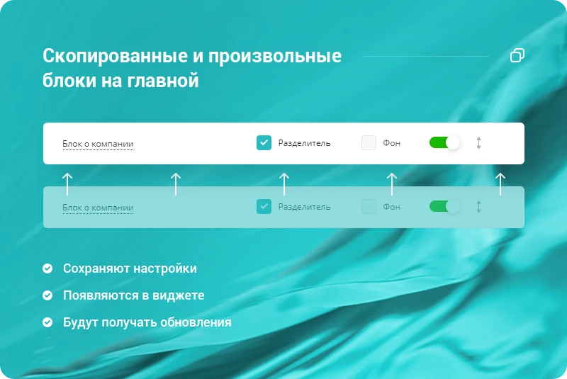 Создавайте свои блоки на главной. Берите за основу любой из типов отображения баннеров или блока о компании. Скопированный блок сохранит настройки, появится в виджете и сможет получать обновления вместе со старыми блоками. Блоки на главной странице можно разместить в произвольном порядке.