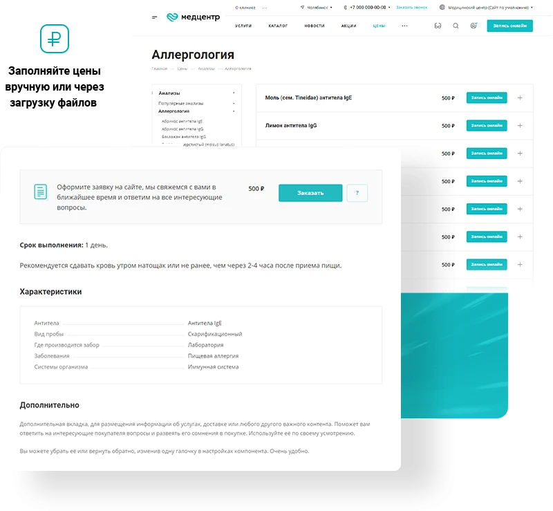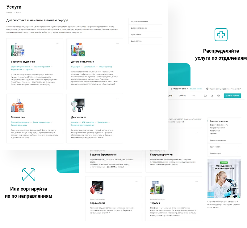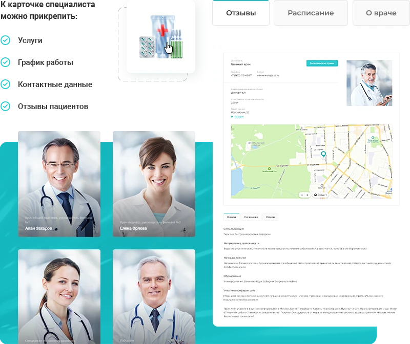 К странице каждой услуги можно привязать соответствующих специалистов, отзывы пациентов, фотогалерею и прочие элементы для повышения конверсии сайта.