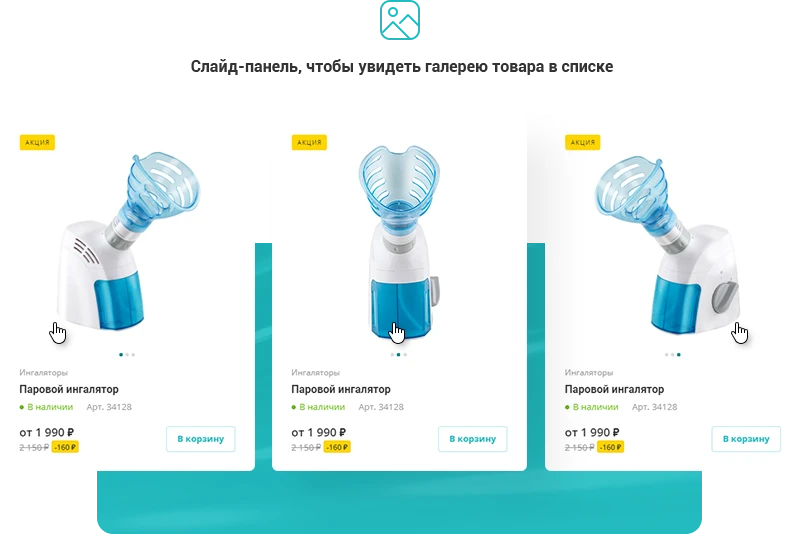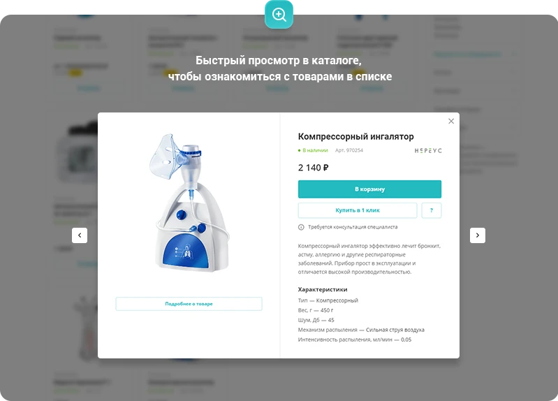 - Быстрый просмотр карточки товара для подбора товара прямо из каталога.