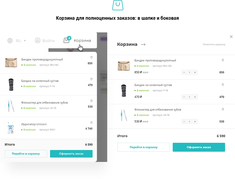 - Два вида отображения каталога для быстрого или подробного ознакомления с ассортиментом.