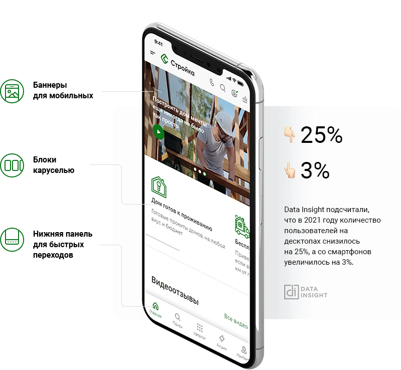 Функционал готового решения "Стройка 2.0" адаптирован под экраны любых размеров. Не теряйте трафик, увеличивайте вовлеченность и уменьшайте количество отказов.