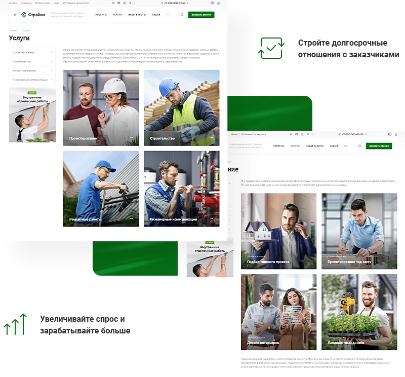 - Подрядные организации. Конфигурация подойдет строительным компания технологической специализации: ремонт и отделка, проектирование, инженерные коммуникации и др. Раздел с услугами на главной для быстрого знакомства с перечнем работ и перехода в нужную карточку. Также на главной странице расположен блок с сотрудниками для большего доверия пользователей. Получайте заявки и предоплату сразу через сайт.