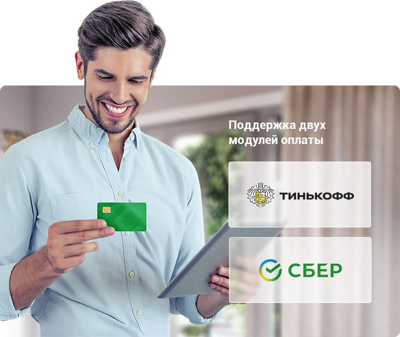 С решением "Стройка 2.0" вы сможете собирать заявки и получать предоплату с сайта. Здесь реализована поддержка 2-х модулей оплаты, которые можно приобрести отдельно: «Интернет-эквайринг Сбербанк РФ (прием платежей)» и «Интернет-эквайринг Тинькофф прием платежей»